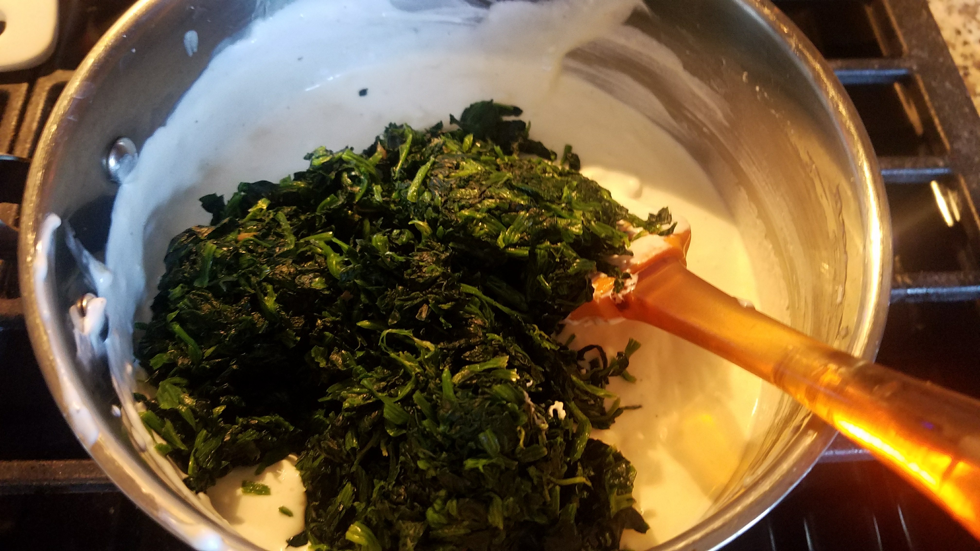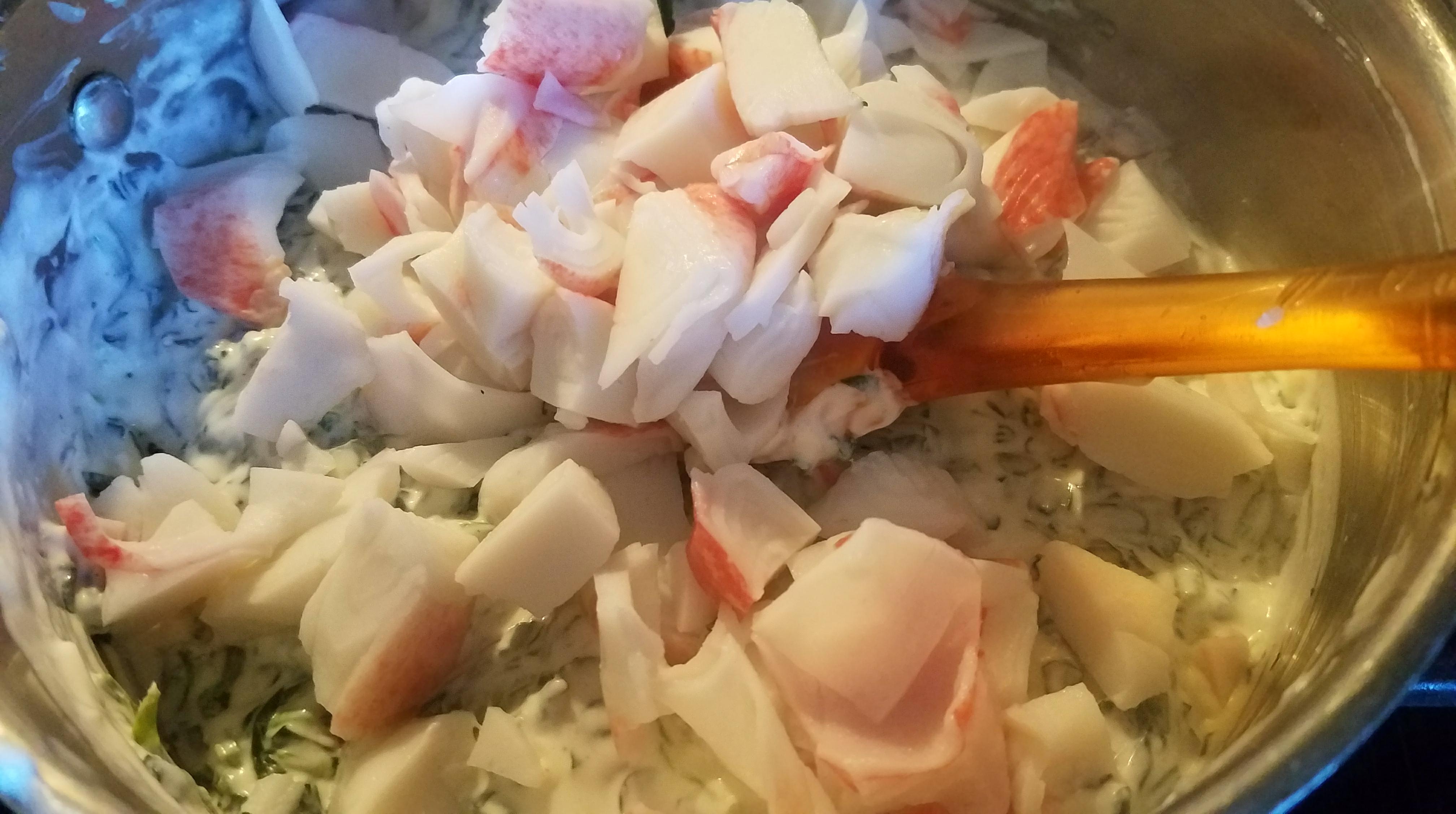 - Add the spinach and the crabmeat. Stir all together until heated through. About 5-7 minutes.